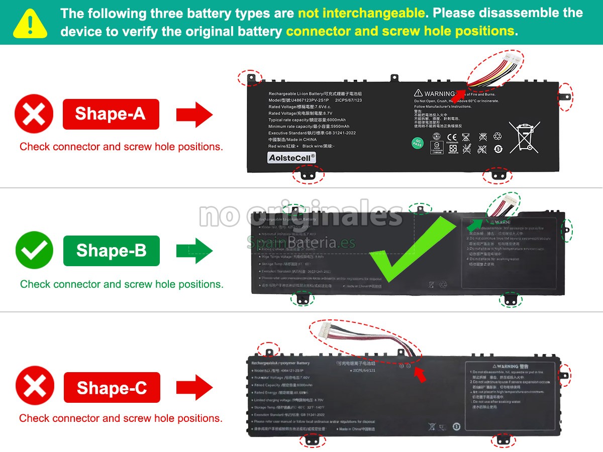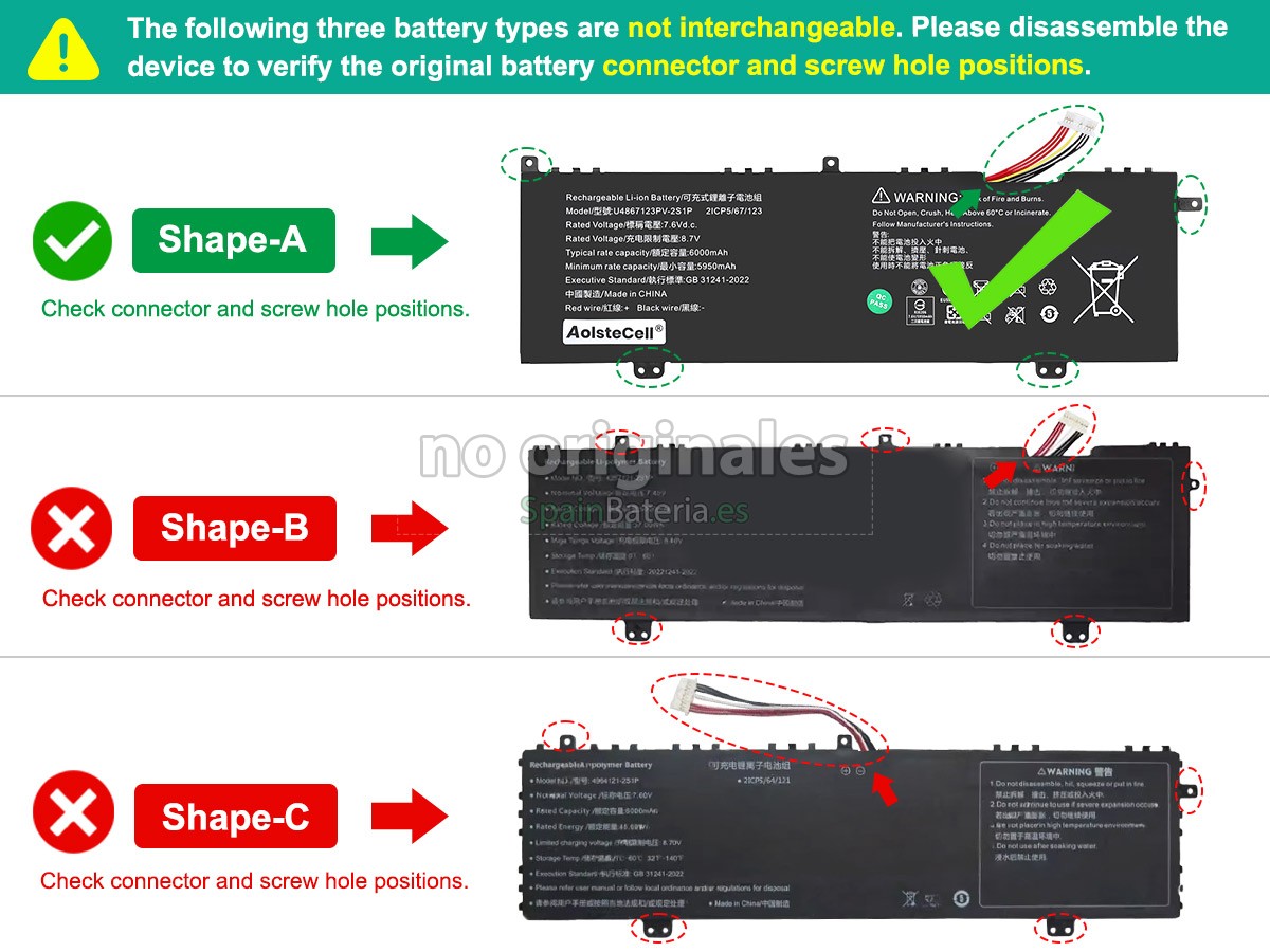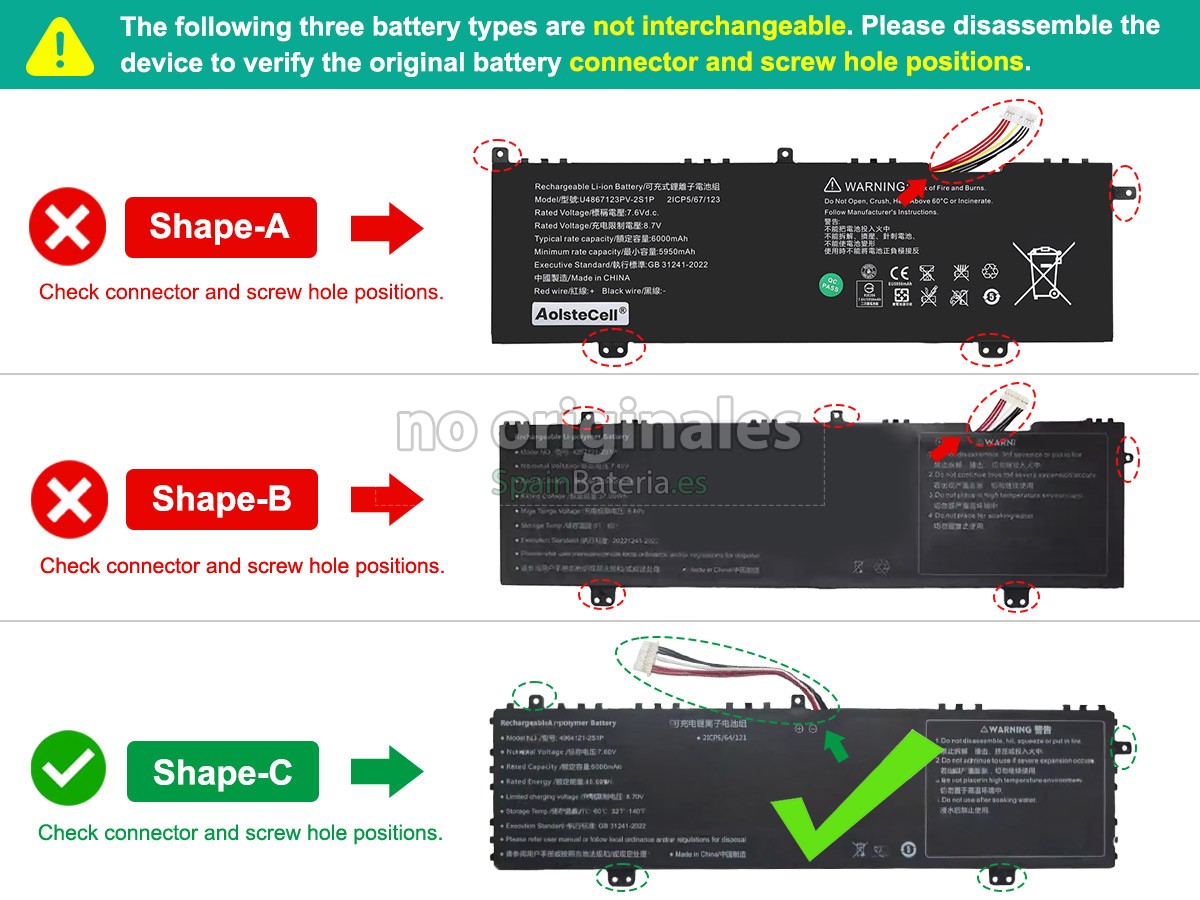 Por favor, compruebe el modelo y la forma de su batería original Acer 4964121-2S1P. Asegúrese de que obtenga la batería correcta.
