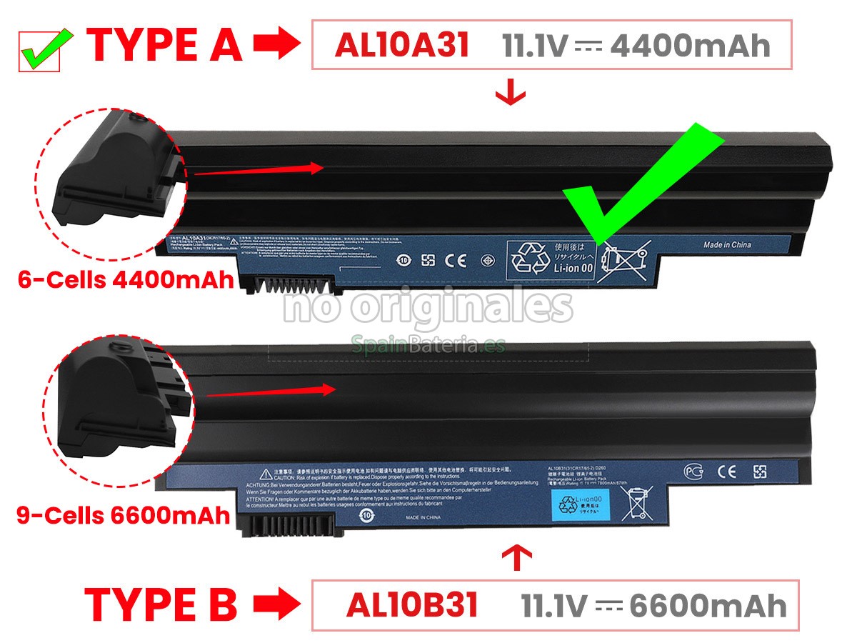 Por favor, compruebe el modelo y la forma de su batería original Acer AL10BW. Asegúrese de que obtenga la batería correcta.