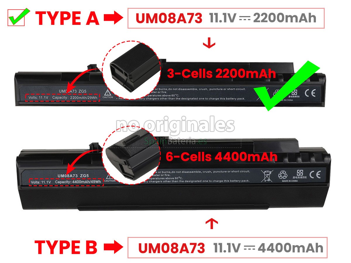 Por favor, compruebe el modelo y la forma de su batería original Acer UM08B72. Asegúrese de que obtenga la batería correcta.