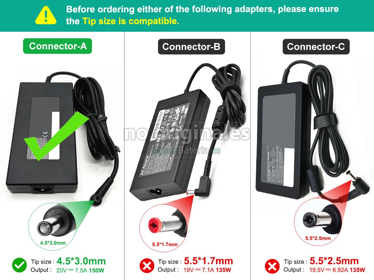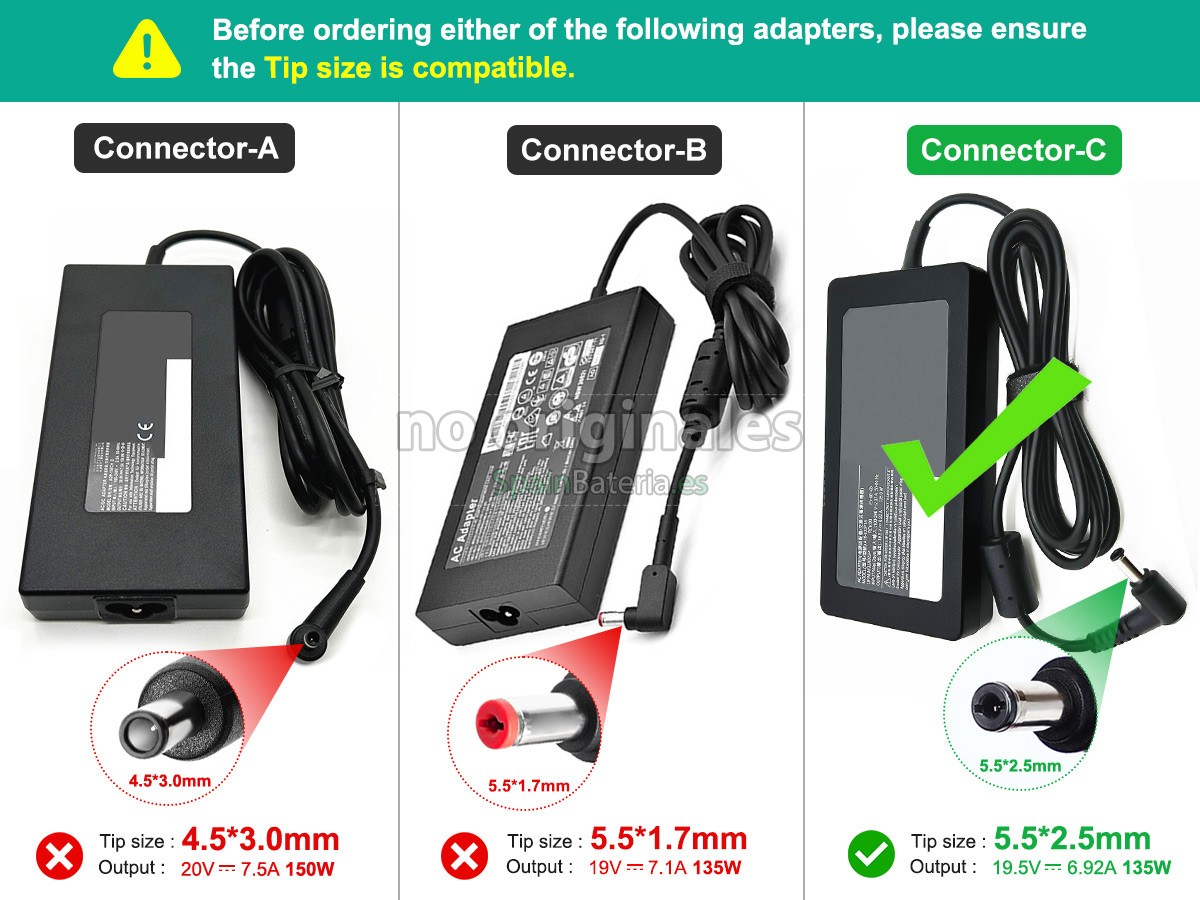 Por favor, compruebe el modelo y la forma de su adaptador original. Asegúrese de que obtenga la adaptador correcta.