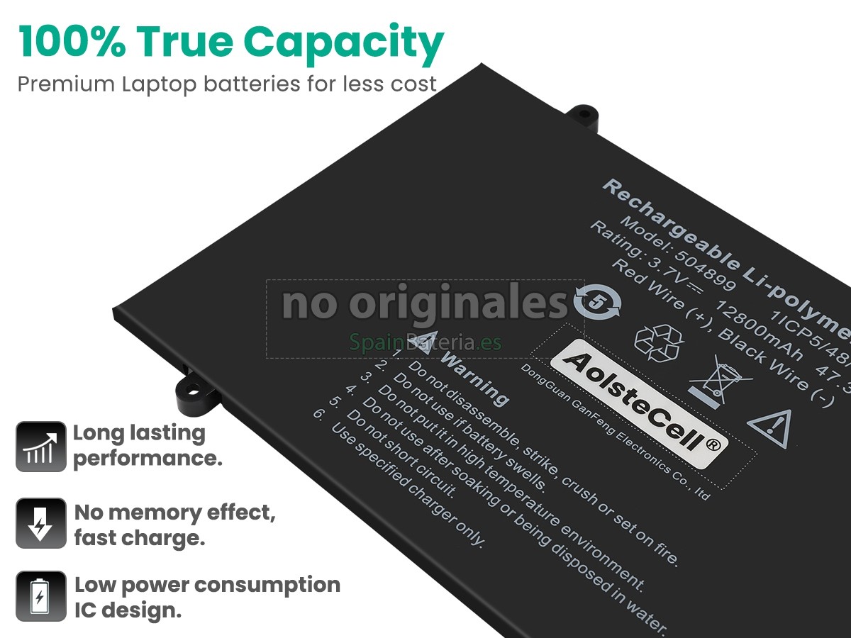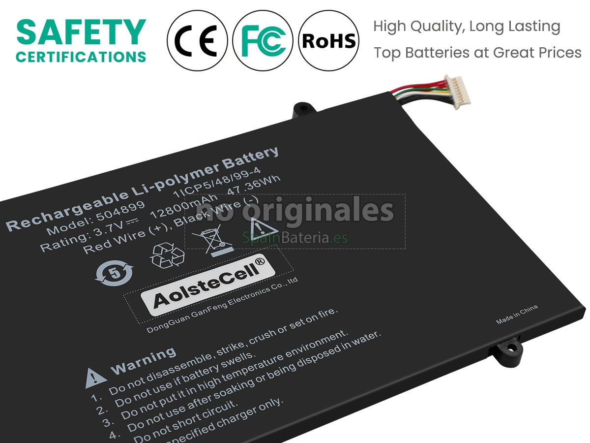 Tenemos requisitos estrictos sobre el rendimiento y la seguridad del producto. La batería para ordenador portátil AolsteCell 504899 tiene que aprobar con una serie de rigurosas inspecciones de calidad y pruebas de seguridad. Además, nuestra batería del portátil AolsteCell 504899 se vende directamente en SpainBateria.es, entonces el precio es aproximadamente 20-50% más bajo que el de otros intermediarios y tiendas reales.