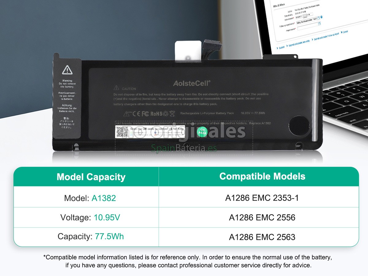 Note : 1. 10.95V and 11.1V are compatible, they are in common use. 2. This battery(A1382) only fits for Apple MacBook Pro 15.4 inch Unibody A1286(EMC 2353-1*),A1286(EMC 2556*),A1286(EMC 2563*)(Early 2011,Late 2011,Mid 2012).3. Package Includes: 1 x Battery ,2 x Screwdrivers.