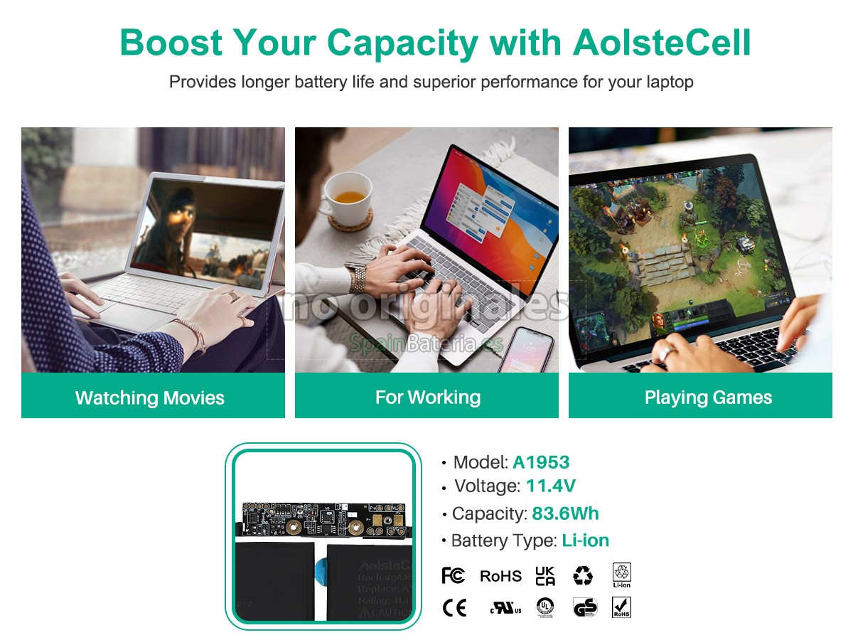 Tenemos requisitos estrictos sobre el rendimiento y la seguridad del producto. La batería para ordenador portátil Apple MacBook Pro 15 inch TOUCH BAR A1990(EMC 3215) tiene que aprobar con una serie de rigurosas inspecciones de calidad y pruebas de seguridad. Además, nuestra batería del portátil Apple MacBook Pro 15 inch TOUCH BAR A1990(EMC 3215) se vende directamente en SpainBateria.es, entonces el precio es aproximadamente 20-50% más bajo que el de otros intermediarios y tiendas reales.
