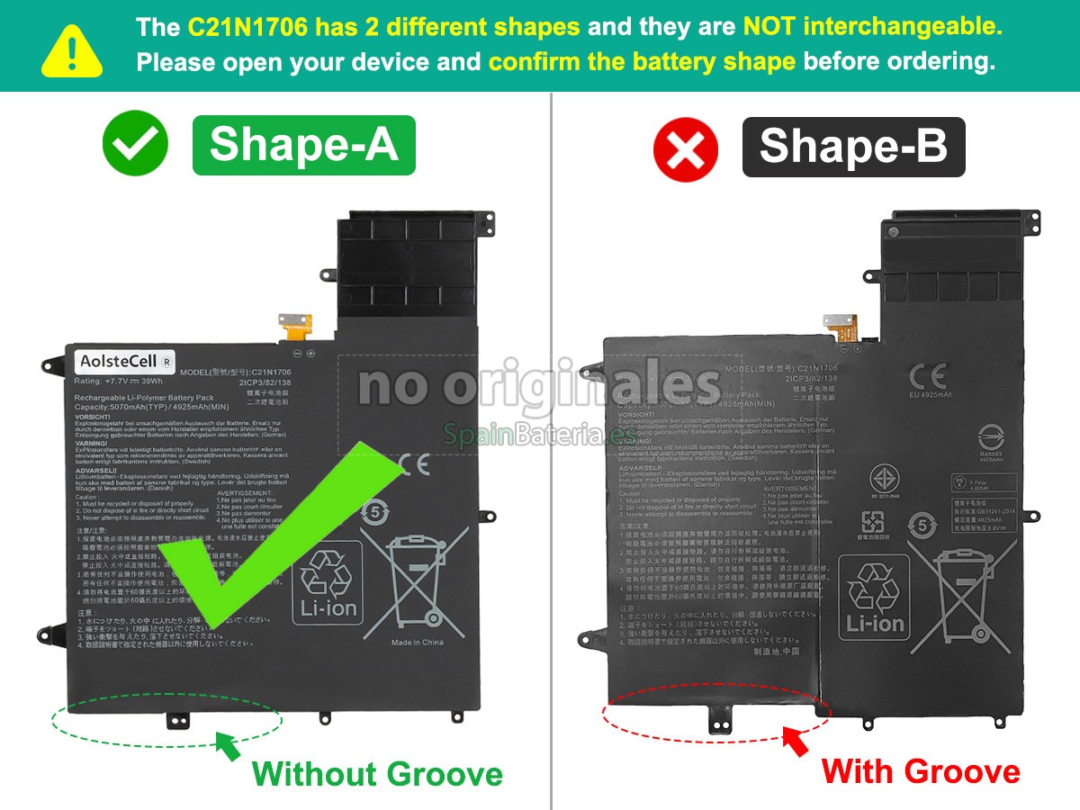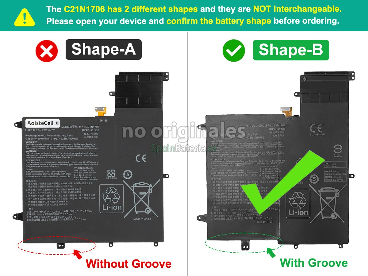 Por favor, compruebe el modelo y la forma de su batería original Asus C21N1706(2ICP3/82/138). Asegúrese de que obtenga la batería correcta.