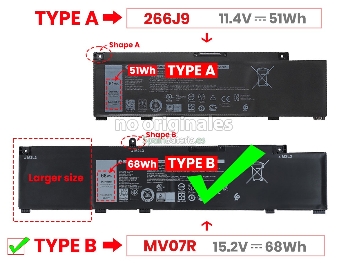 Por favor, compruebe el modelo y la forma de su batería original Dell 072WGV. Asegúrese de que obtenga la batería correcta.