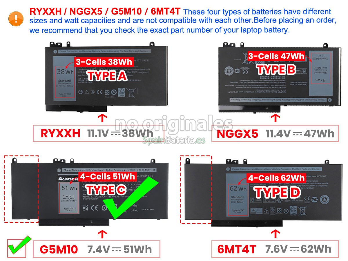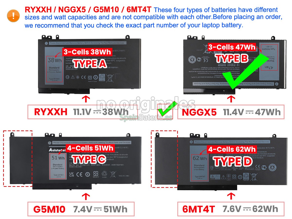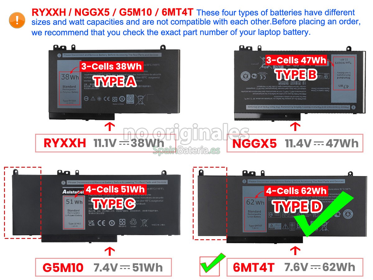 Por favor, compruebe el modelo y la forma de su batería original Dell 0JY8D6. Asegúrese de que obtenga la batería correcta.
