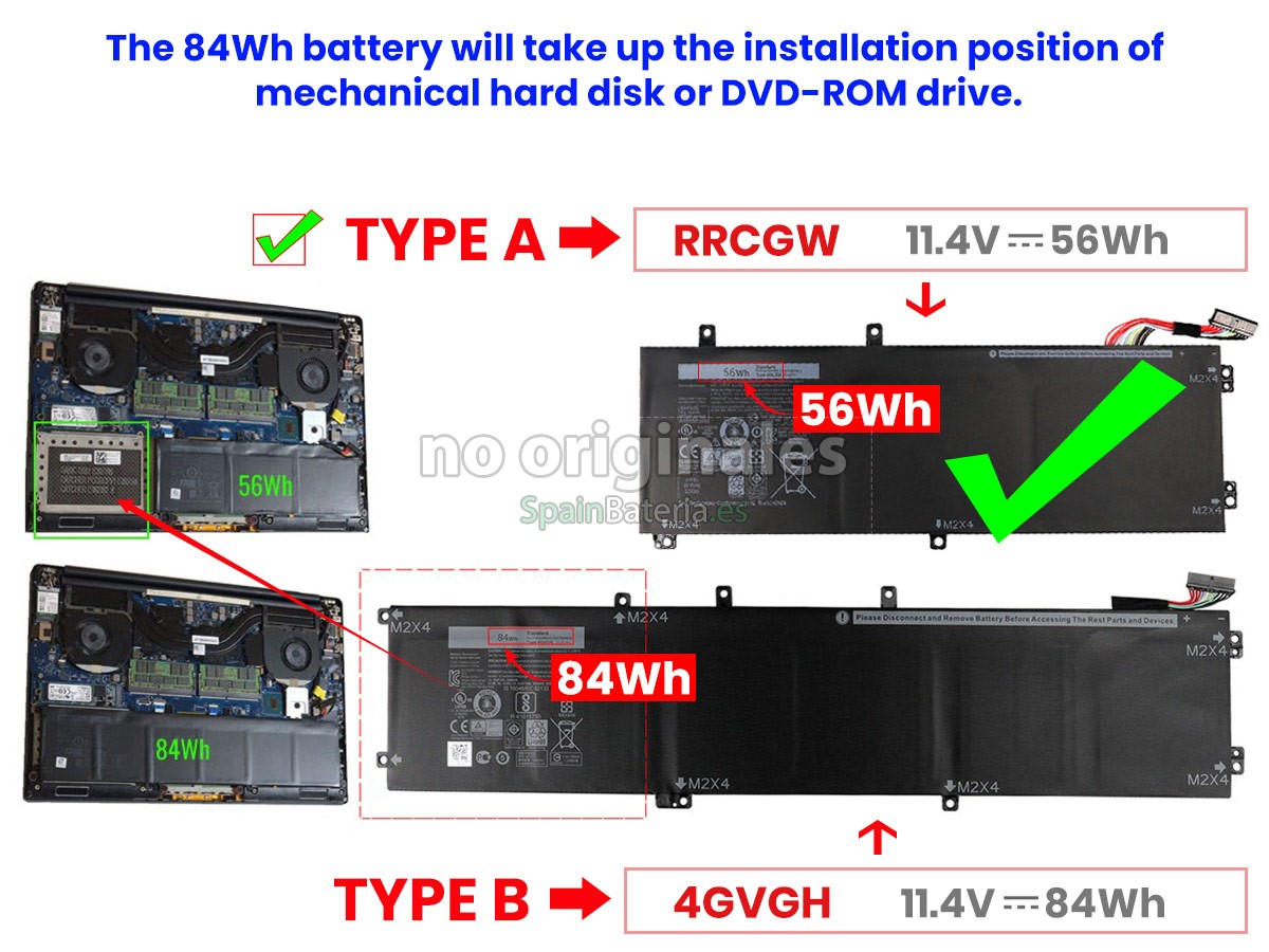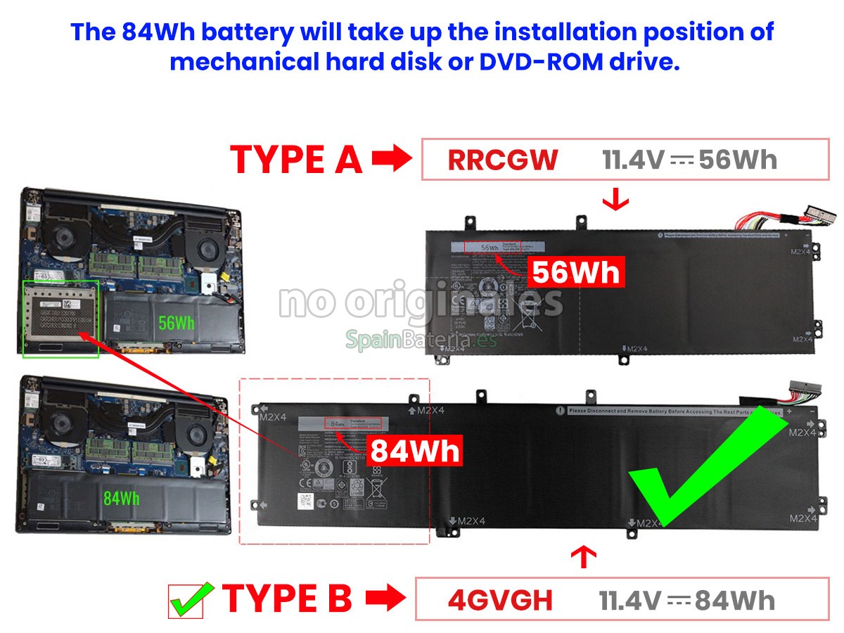 La larga duración de la batería Dell 4GVGH contiene células de batería de grado A para garantizar una mayor duración de la batería y más ciclos de carga. Entrega rápida, devoluciones fáciles y 100% de reembolso por 30 días. This is a high capacity(84Wh) battery,it's longer than the standard 56Wh battery, and it will take up the installation position of mechanical hard disk or DVD-ROM drive. You can use the 84Wh battery unless your laptop not installed the mechanical hard disk or DVD-ROM, otherwise please use the 56Wh battery.