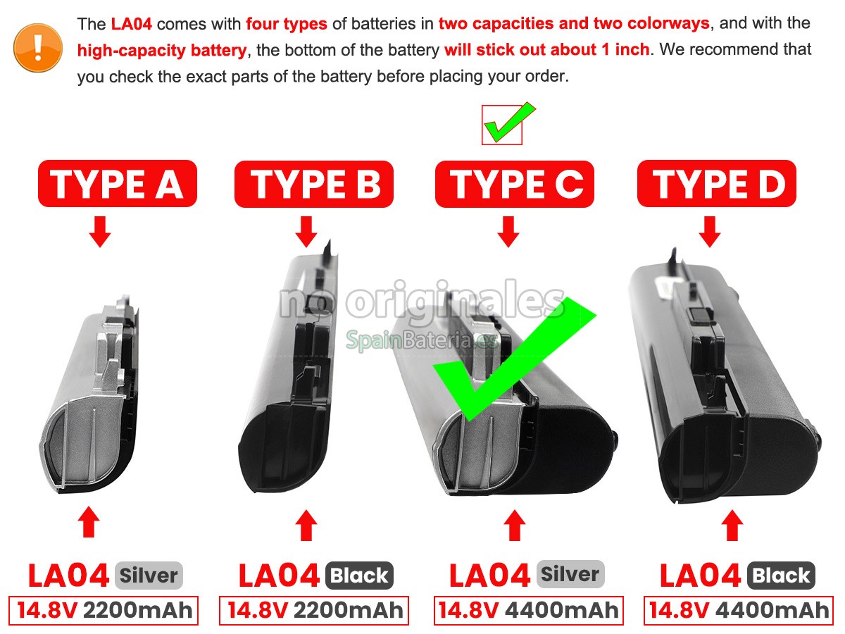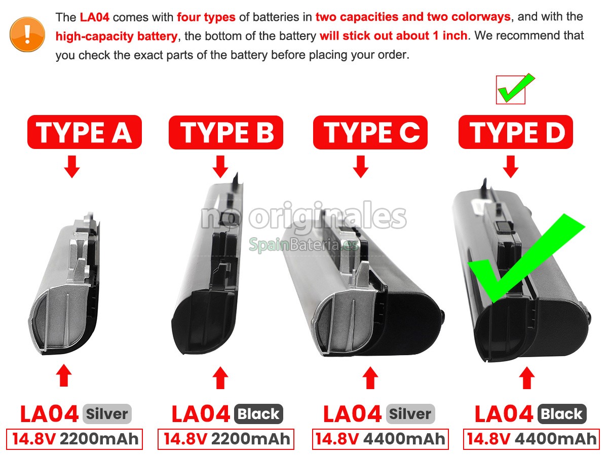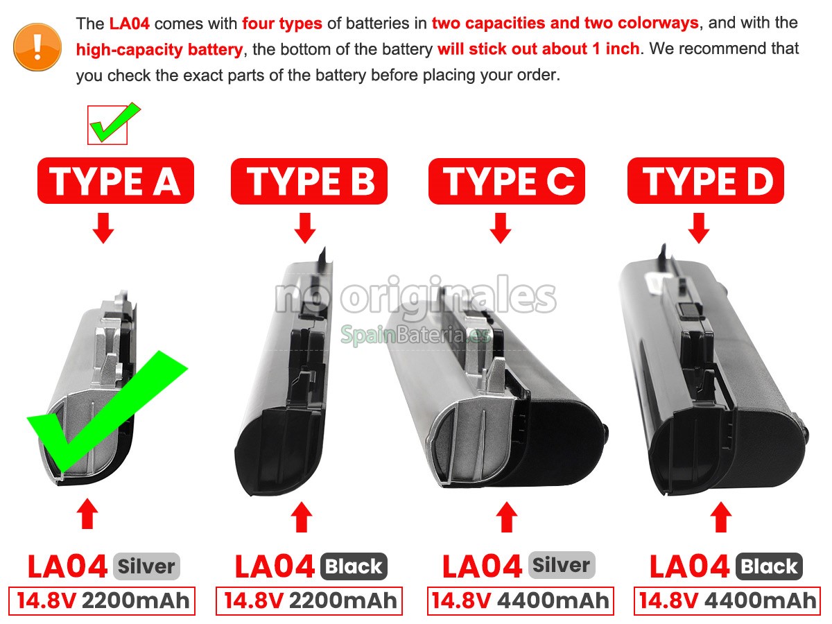 Note : 1. 14.4V and 14.8V are compatible, they are in common use. 2. Please ensure your old battery model is "HP LA04",not "HP OA04", since "HP LA04" and "HP OA04" batteries are very similar, but not the same battery.3. The 4400mAh(8 Cells) battery will extend out about 1 inch from the bottom of the laptop, bigger size but lasting longer.