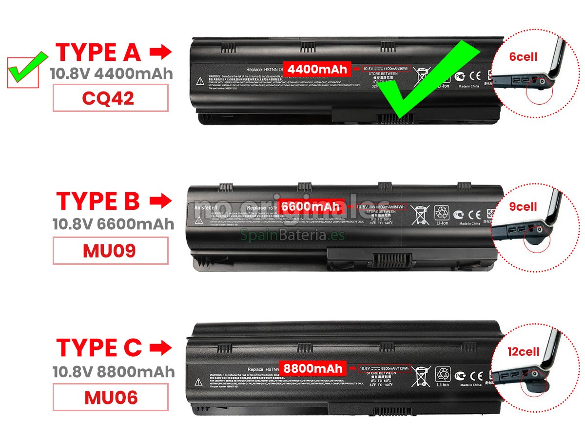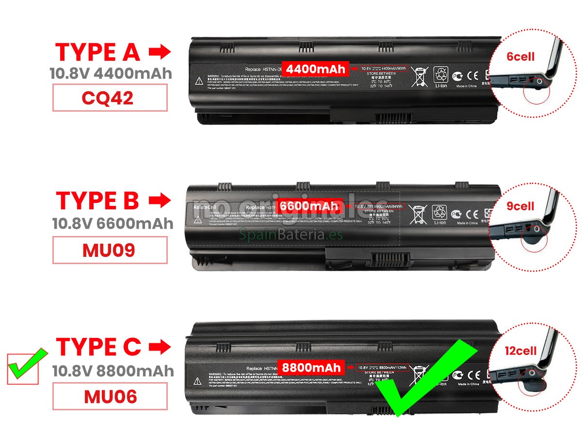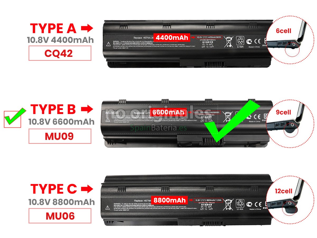 Elija la batería HP G62-B23ER correcta. En las mismas condiciones de uso, una batería de menor capacidad se acortará la vida más rápido que una batería de mayor capacidad porque debe cargarse más a menudo.