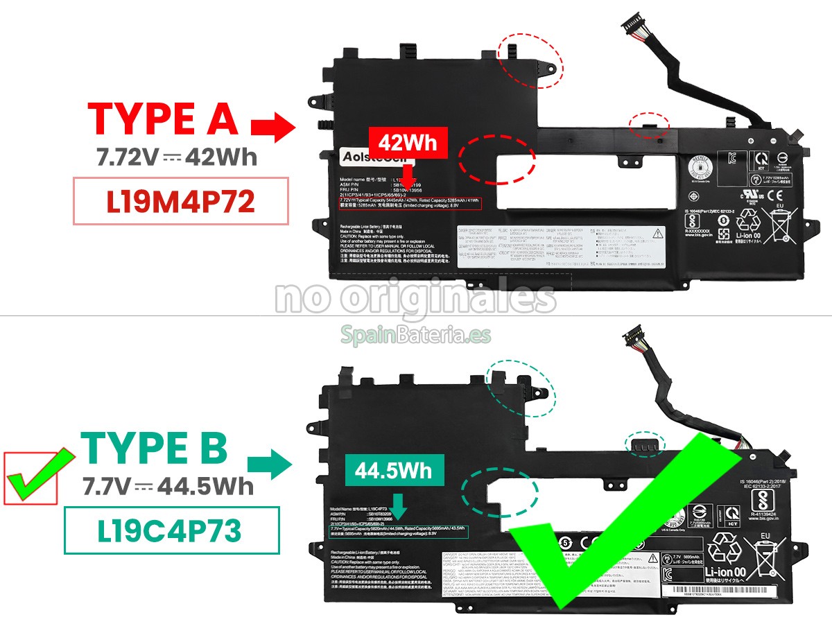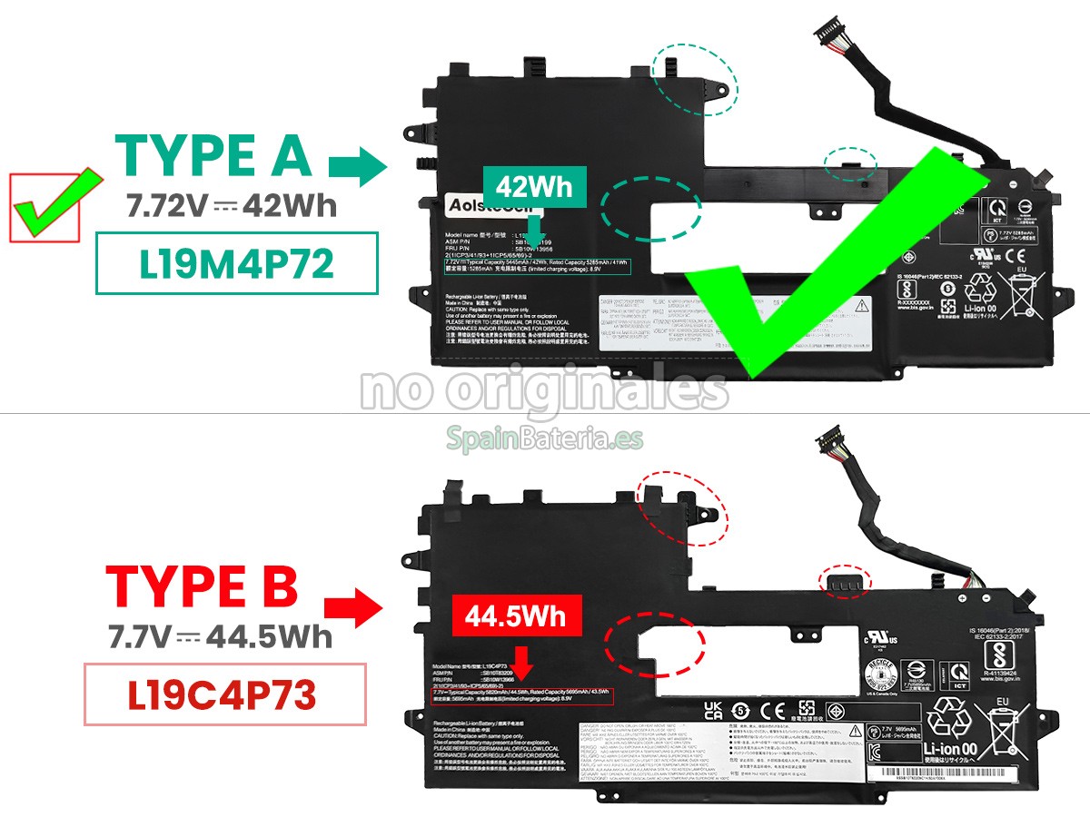 Por favor, compruebe el modelo y la forma de su batería original Lenovo L19M4P72. Asegúrese de que obtenga la batería correcta.